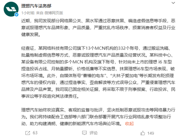 理想汽车方面强调,公司一贯接受客观、真实的舆论监督与批评,但坚决反对有组织、有目的的网络诋毁行为和恶意攻击,并表示将积极配合工信部等六部门联合发起的“汽车行业网络乱象专项整治行动”,共同推动建立清朗、健康的行业舆论环境。