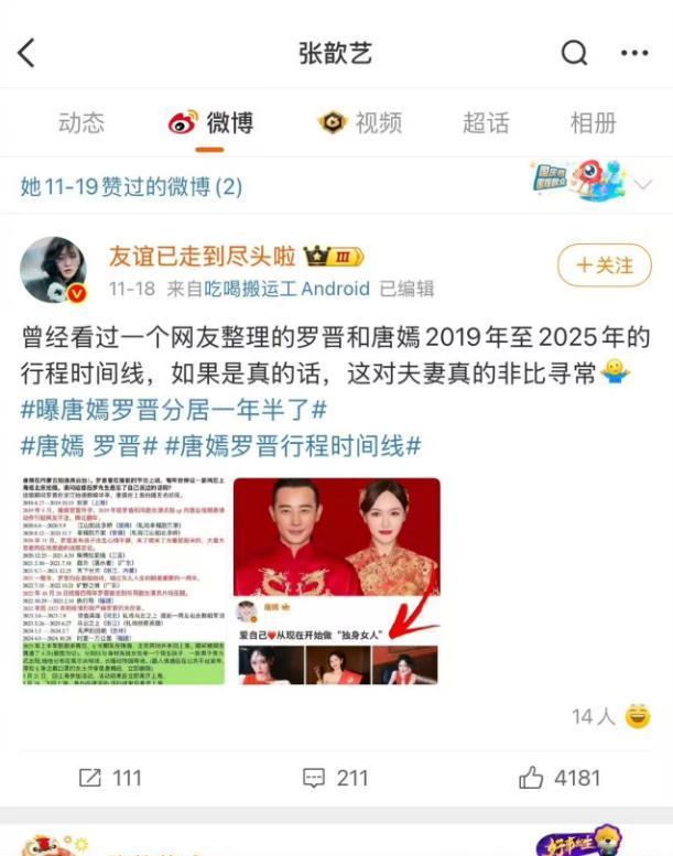张歆艺点赞的这条内容,包含了唐嫣罗晋分居一年半的行程时间,以及吐槽这对夫妻真的非比寻常。