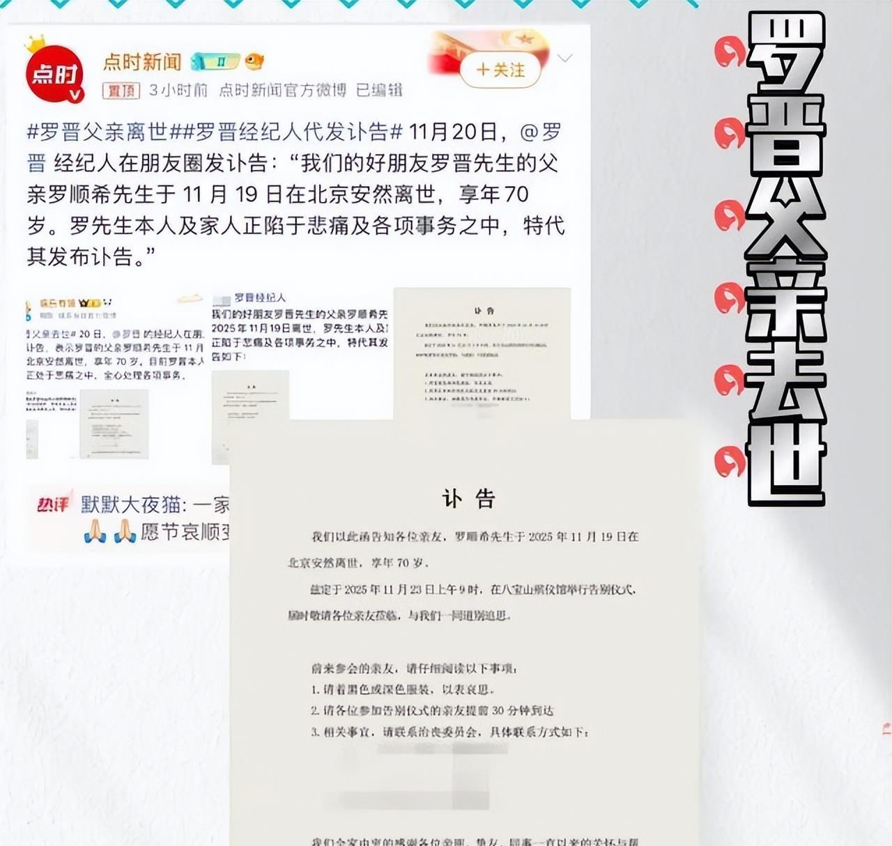 就在谣言愈演愈烈之时,11月20日罗晋经纪人发布的讣告如同一记重锤:罗晋父亲罗顺希于11月19日在北京因病去世,享年70岁。这场家庭悲剧彻底颠覆了舆论走向——原来罗晋近一年的“消失”并非婚变,而是全心照顾病重的父亲。