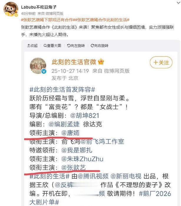 主演是唐嫣、俞飞鸿、娜扎、以及张欣怡,目前还只是在10月份官宣,尚未开机。张歆艺与唐嫣此前的交集也并不多,应该不会故意点赞制造是非,应该是无意间吃瓜手滑。