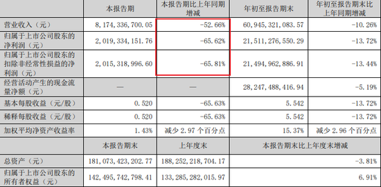 营收81.74亿,同比下滑52.66%;扣非净利润20.15亿,同比下滑65.81%。