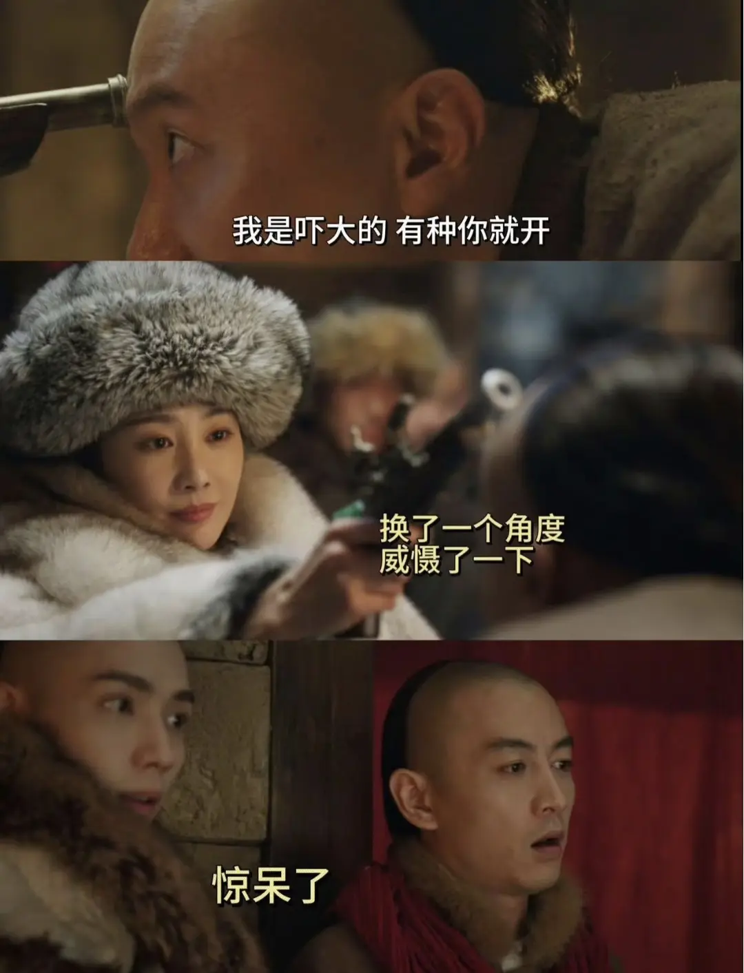 在科尔沁草原,帐篷里持刀救王爷福晋的戏份中,孙千的握刀姿势却像拿话筒。